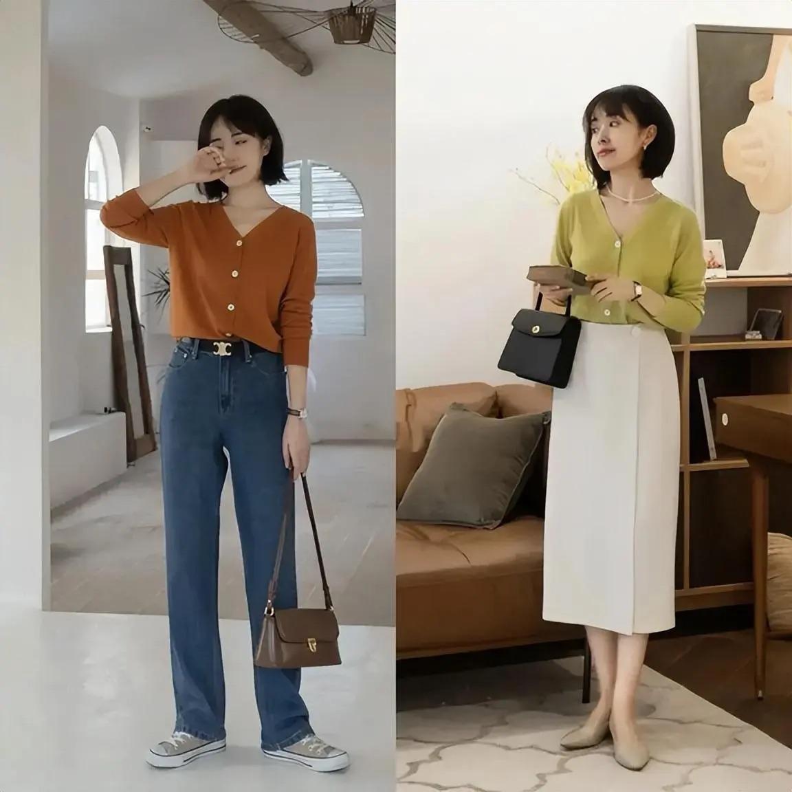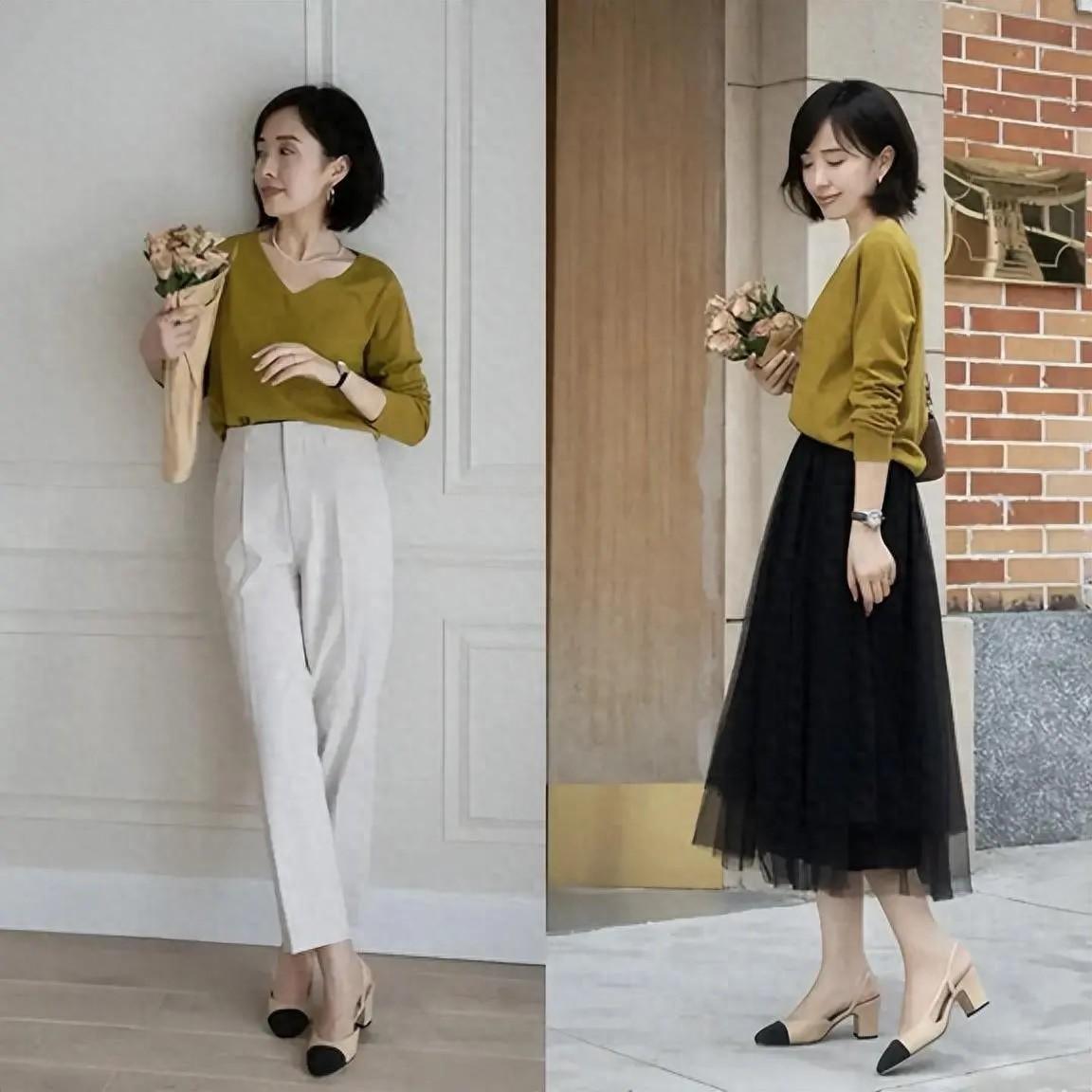 這種薑黃色的針織衫,不管是冷白皮還是暖黃皮,都可以穿着。套頭款式的針織衫,更加低調保守,開衫款式的針織衫、更加隨性百搭。