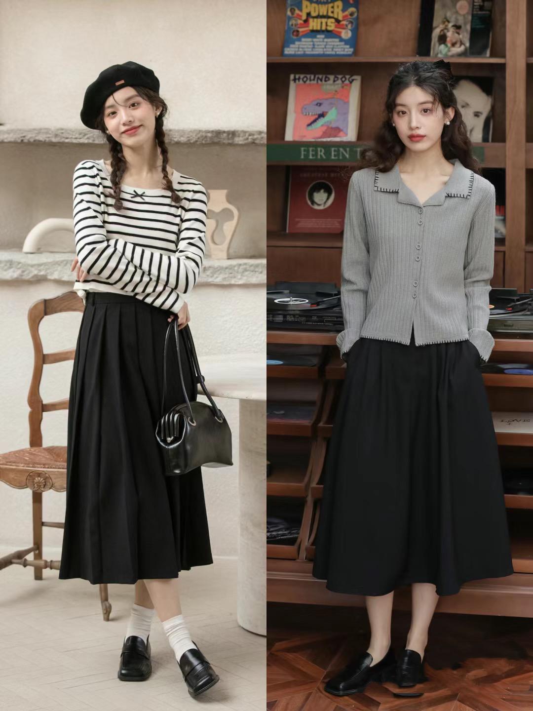 這種修身的針織衫,我們可以搭配高腰的半身裙來穿着。寬鬆一點的半身裙,經典的黑色系穿起來更加大方耐看。早春季節穿着黑色半身裙,一定要塑造出少許的露膚。