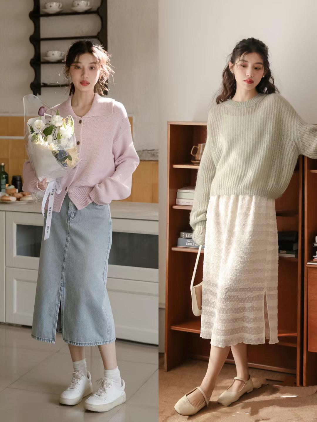 搭配針織衫的時候,半身裙也有各種款式可以選擇。比如直筒的牛仔半身裙、或者輕盈的蕾絲半身裙,