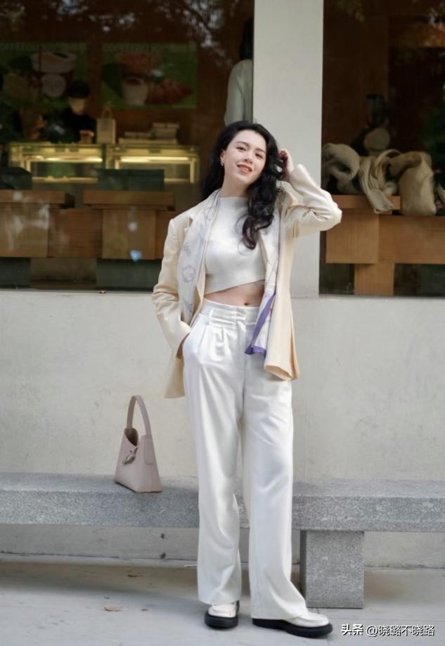 以上兩種穿搭方法,前者是彰顯最標準的比例狀態,後者則是讓我們的整體身形更加顯高挑。在此基礎上在這裏也要教給大家一個技巧,上面的單品與長款的褲裝或者裙裝完全可以呈現分割的色系來進行彰顯,在視覺上進行一定的強調讓上短下長更爲直觀。