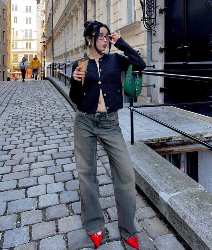 同色包包和樂福鞋的加持下,爲整個着裝增添了幾分復古感。