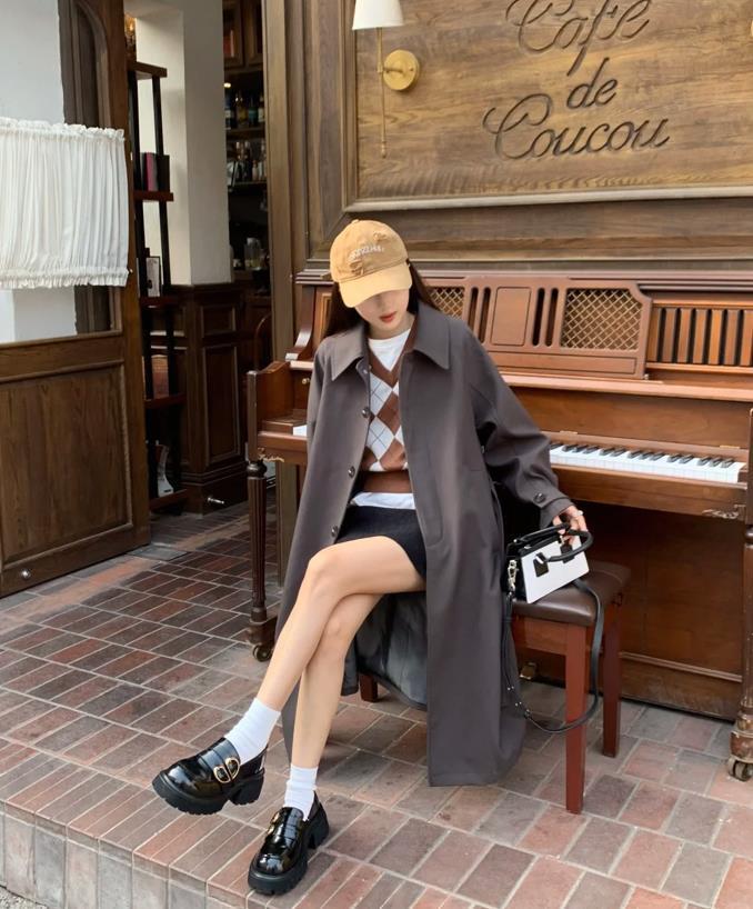 這一身看起來複古又不失氣質,黑色漆皮樂福鞋,自帶高級感,也非常百搭。這麼一雙樂福鞋穿起來真的好顯腿細,即使是厚底也讓你穿出輕便感,搭配風衣日常又不失通勤。