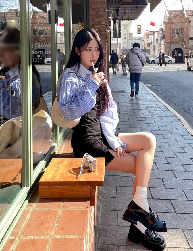 喜歡韓劇歐尼風的穿搭麼?可以試試這一套,超級適合春天的,藍白條紋襯衫+小黑裙+短襪+樂福鞋,特別好看的穿法,適合小個子女生。