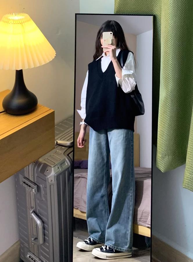 喜歡簡單幹淨的穿搭,黑色匡威帆布鞋,真的很舒適自在也百搭,白色襯衫+黑色馬甲,這兩種單品疊穿一起完全沒有問題的。搭配一條牛仔闊腿褲,顯瘦又減齡。