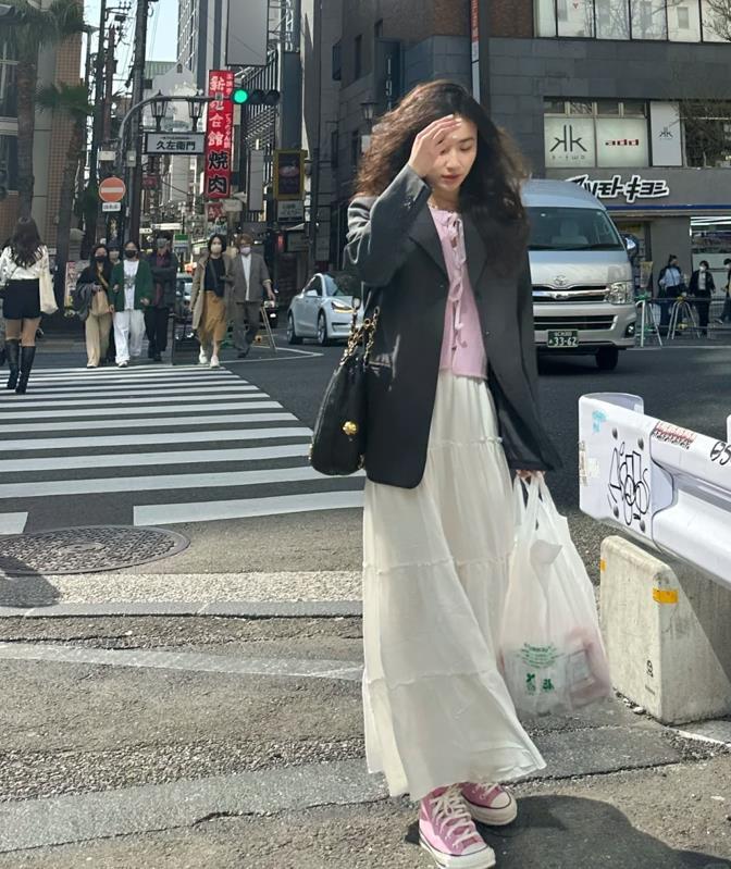 搭配白色半身長裙,小仙女的氣息就打造了,腳下一雙粉色帆布鞋,很好與內搭進行了呼應。