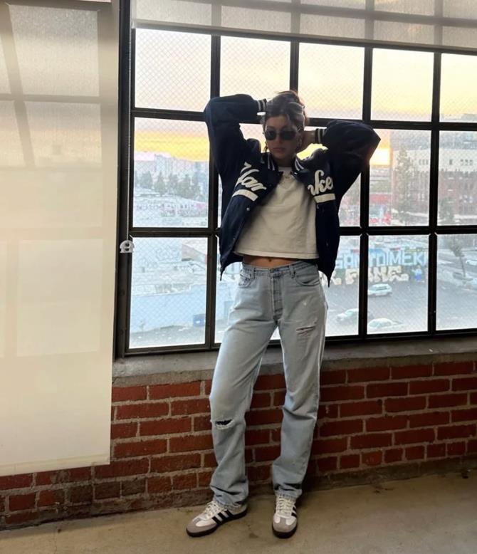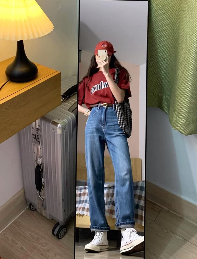 酒紅色字母t恤+直筒牛仔褲+白色帆布鞋,很日常時髦又休閒的一套,t恤和棒球帽的顏色一致,增加和諧度的同時又好看。