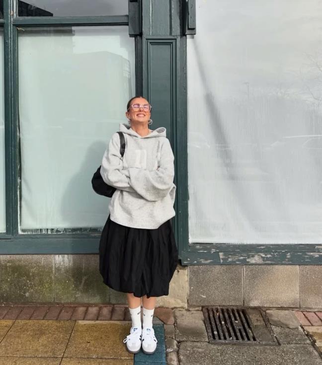 早春嘗試下美式Bella風的穿搭,白色運動風外套+灰色半身長裙,鞋子選了一雙運動鞋,利用棒球帽和耳飾進行點綴,算是整套的穿搭點睛之筆了。