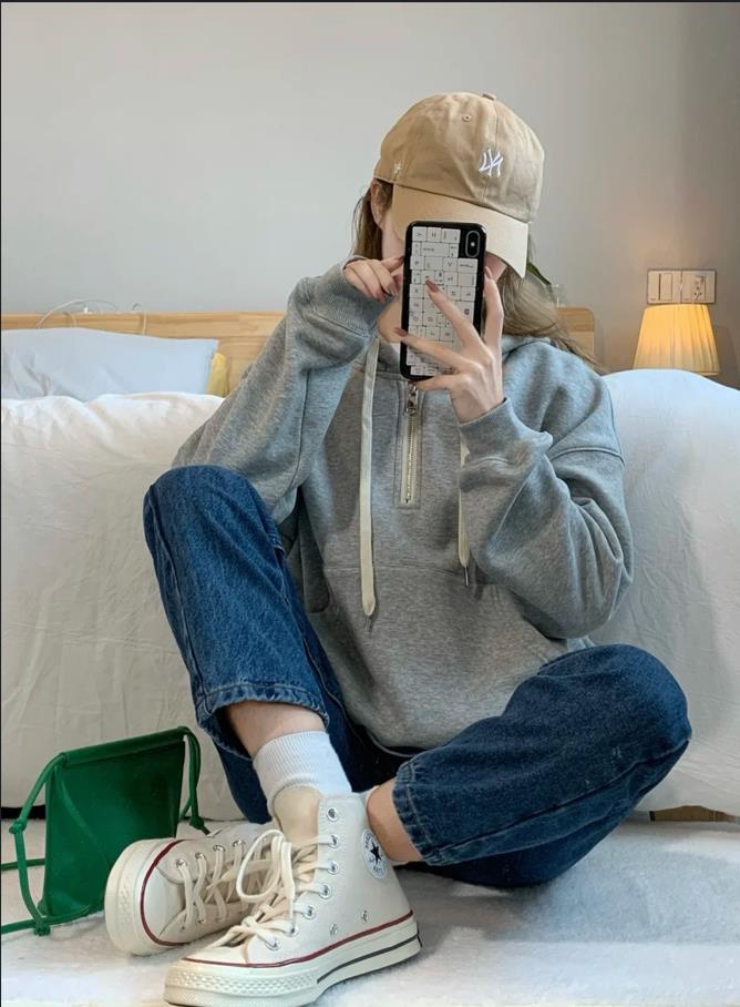 喜歡衛衣和牛仔褲的搭配,在春季,一定要試試這樣穿,不僅減齡時髦,還非常顯青春和活力。高級灰的衛衣,和牛仔藍的褲子,都是很基礎百搭的款,白色帆布鞋的加入,更添舒適感。