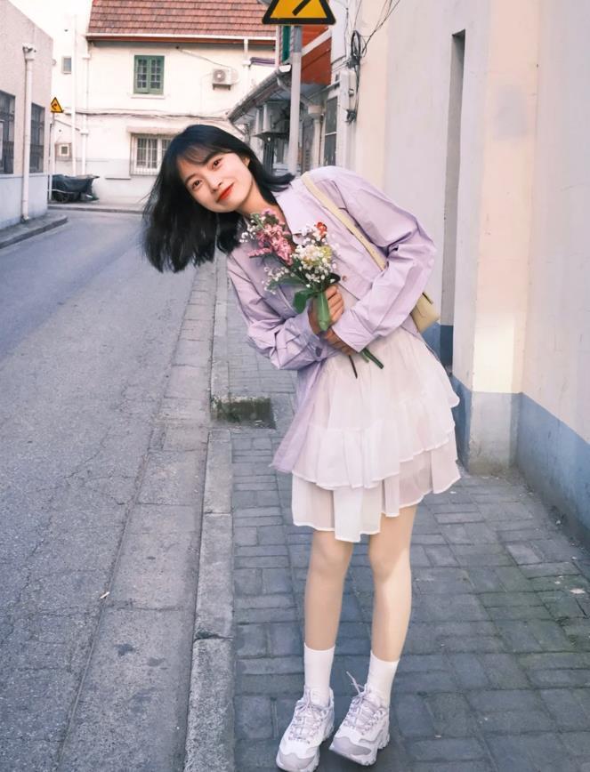 紫色襯衫,搭配白色小裙子,腳上是一雙紫色運動鞋,青春活力又顯腿長。