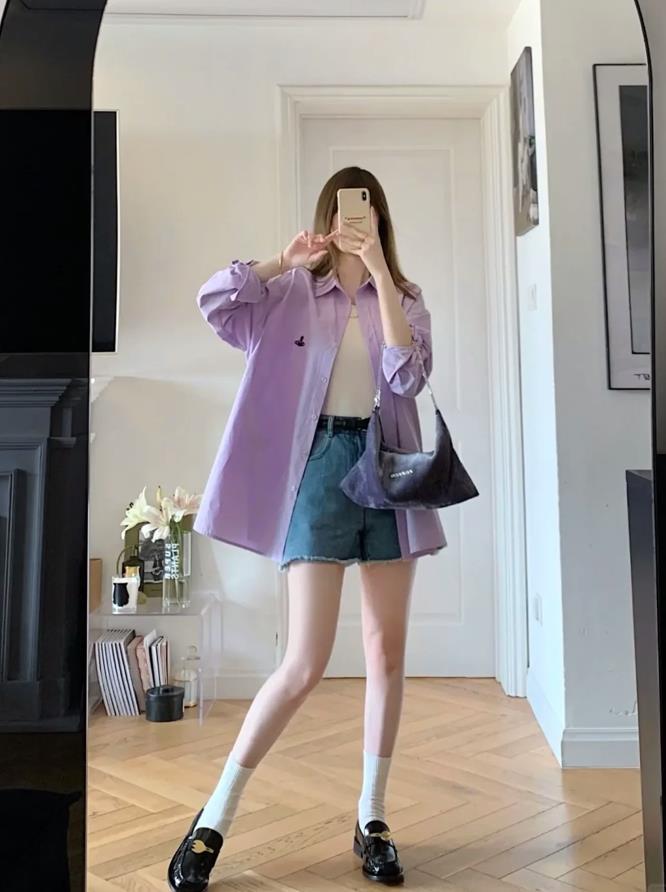 春天穿襯衫,就有種很隨意的感覺,特別好看呢,紫色控第一眼就很喜歡的襯衫,搭配短褲和襪子,黑色的樂福鞋加持下,讓你的着裝更添舒適和自在。
