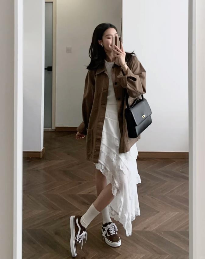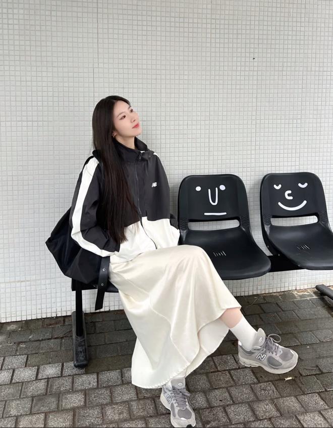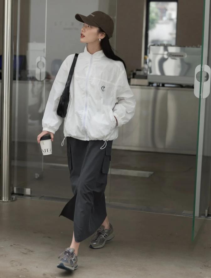 黑白配的穿搭,不管在什麼時候都不會過時的,經典耐看又時髦,這幾年復古風回潮,帶點復古氣息的運動夾克,搭配同樣休閒的白色半裙,整體的黑白配色碰撞,並不會過於休閒,通勤出行或逛街都合適。