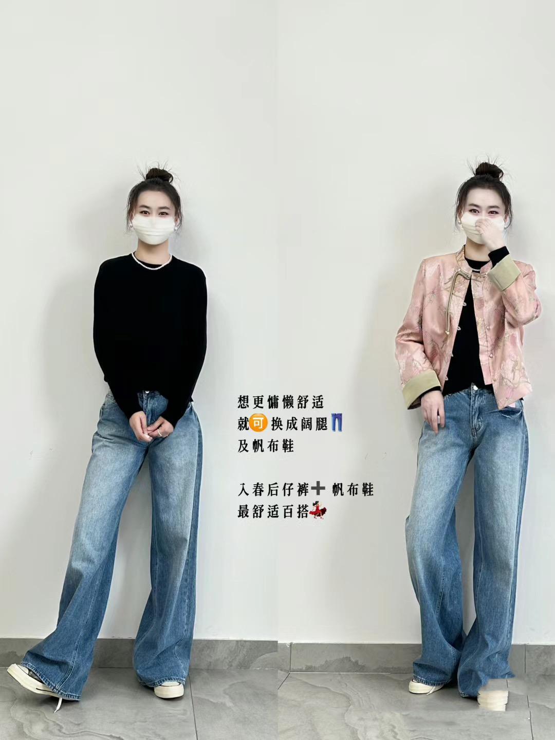 同樣是這件黑色打底衫,與牛仔褲的搭配更加帥酷大方一些,舒適慵懶又很顯腿長。如果擔心極簡風的穿搭風格屬性不明顯,我們可以配新中式外套。