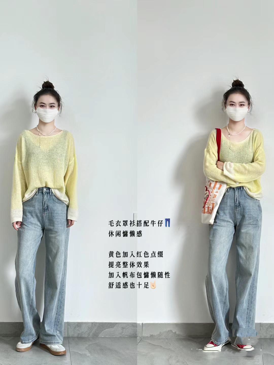 黃色漸變針織衫,搭配了水洗藍的直筒牛仔褲。將針織衫的下襬塞進褲腰裏,輕盈又顯高。高腰的直筒牛仔褲,也很顯腿長。帆布包的融入,增加了慵懶隨性的氛圍,更是耐看。