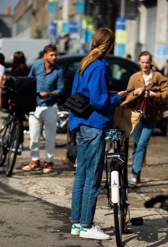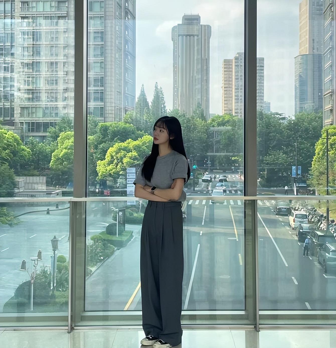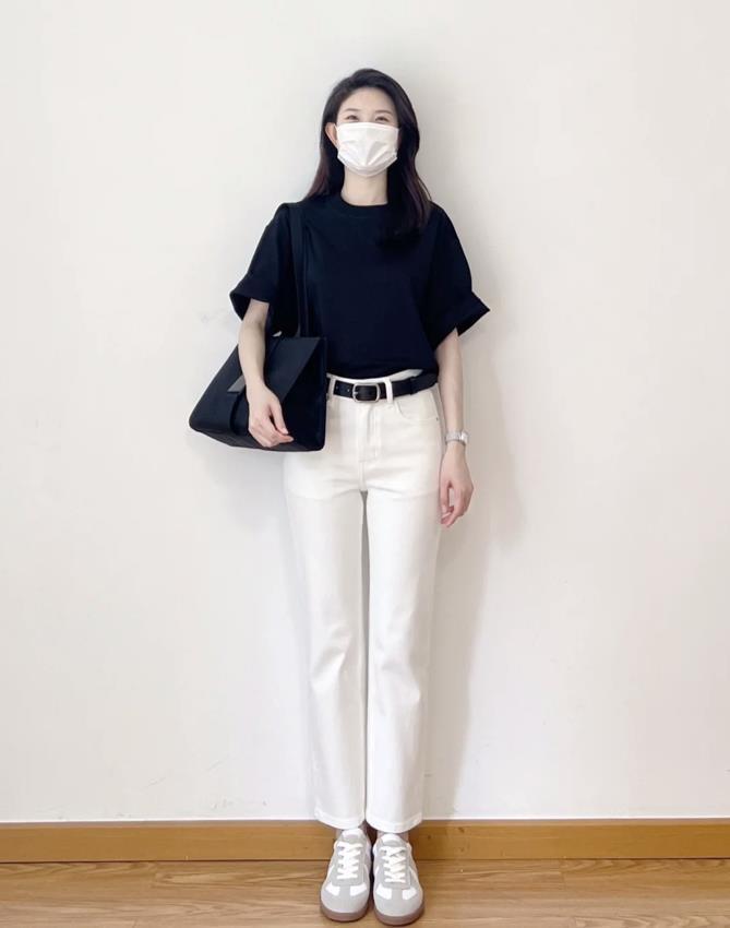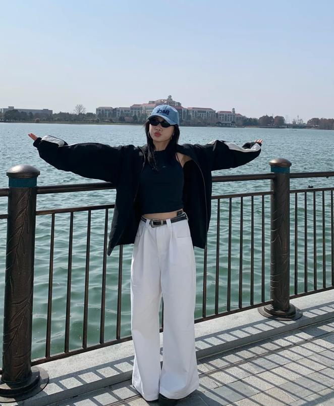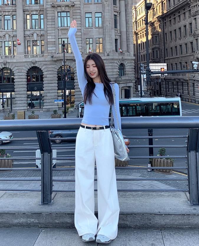 基礎圓領t+闊腿褲,一鬆一緊的組合,優化身材比例的同時,還能拉長腿部線條。藍白配色組合,真的很養眼清爽和治癒,不是太冷的春季,這麼穿着出街踏青超讚。