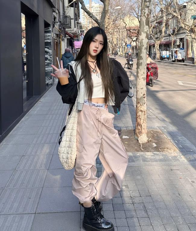 下雨天也不能影響我出門的好心情,推薦姐妹們試試這套酷颯風的打扮,黑外套+粉色工裝褲+馬丁靴,甜酷的味道十足。