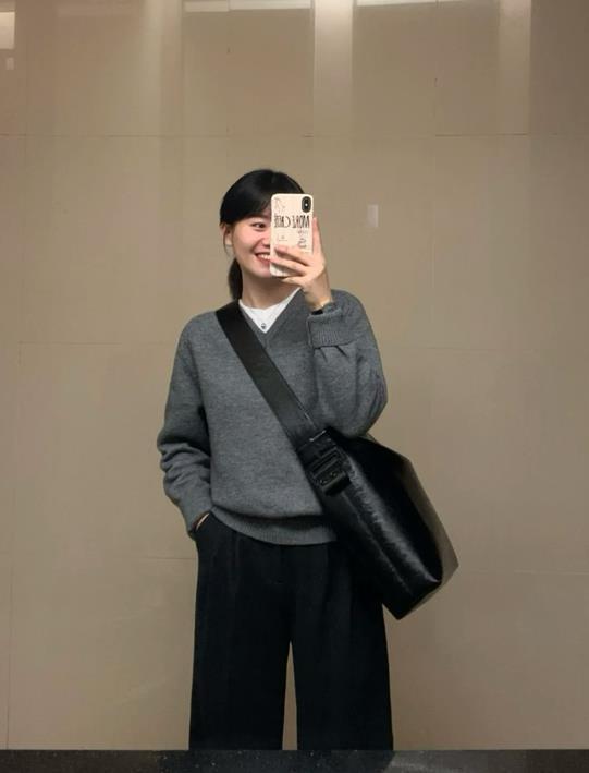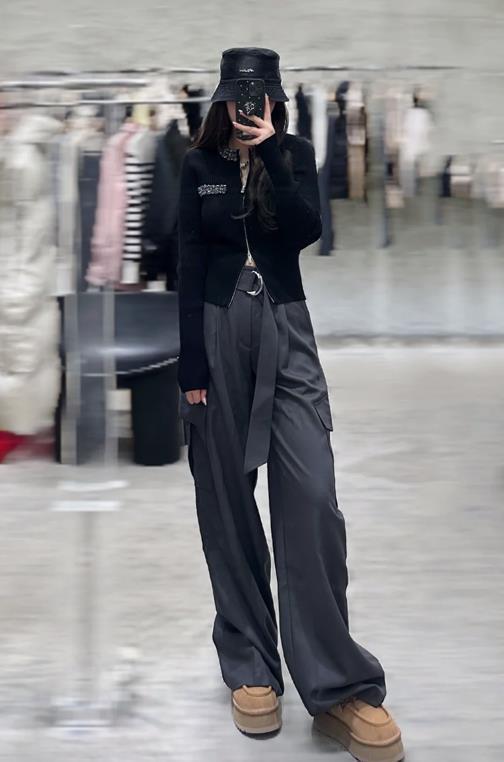 真的有被這身辣到,甜酷辣妹的福音,黑色短針織衫,帶點修身的版型,很好修飾身材,還顯瘦。與灰色工裝褲相配,有種很鬆弛舒適的效果,一個字:帥!