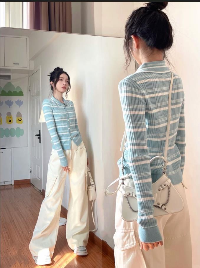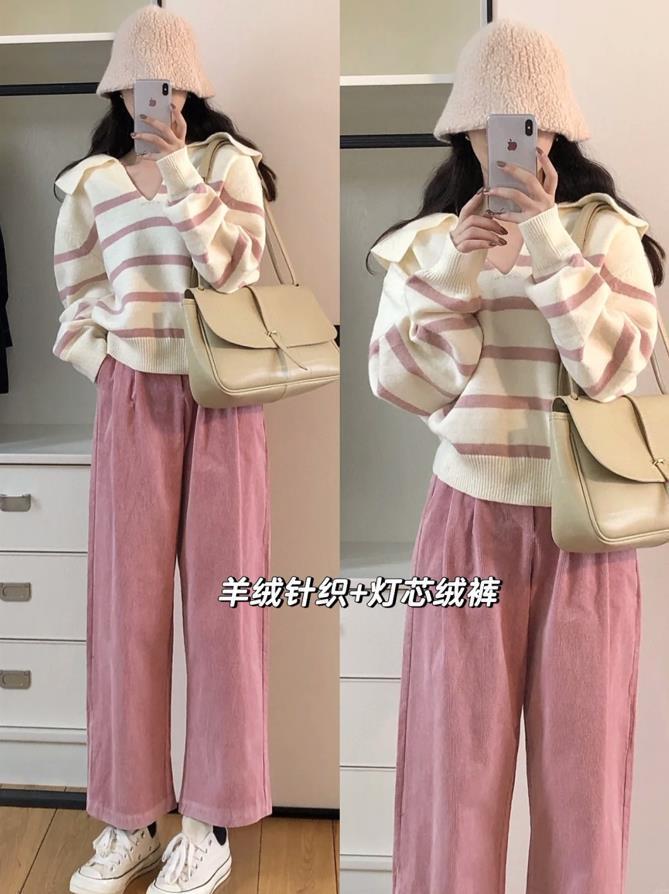 溫柔的針織衫,軟軟糯糯的材質,貼身穿也很舒服,翻領的設計,學院風滿滿,超減齡的。撞色條紋設計,清新少女風就展現了,搭配燈芯絨闊腿褲,有種鬆弛的時髦感。
