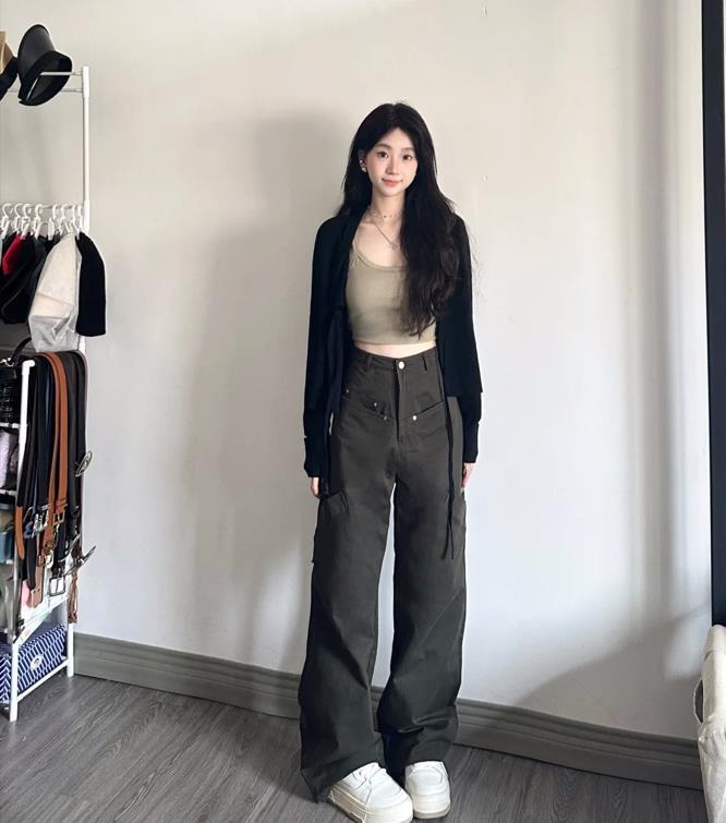 喜歡走帥氣酷颯風格的姐妹,一定要試試這條工裝褲,軍綠色看起來就比較特別,搭配黑色針織開衫+小背心,日常又顯瘦的一套。