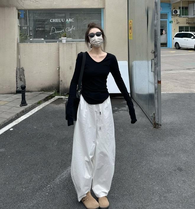 黑白的高級感,相信誰都不會拒絕的吧?上下都是很簡單的基礎款,黑色修身上衣,搭配寬鬆的褲子,鬆緊結合,顯瘦效果絕了。