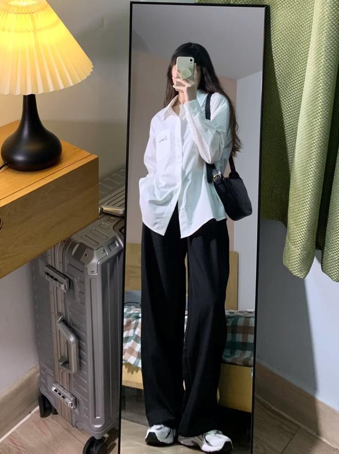 白襯衫+黑色休閒西裝褲,真的太有少年感的一套了,清冷感十足,襯衫的款式不是那種偏修身的,而是有點寬鬆的款式,和同樣休閒的西裝褲組合,鬆弛又隨性。