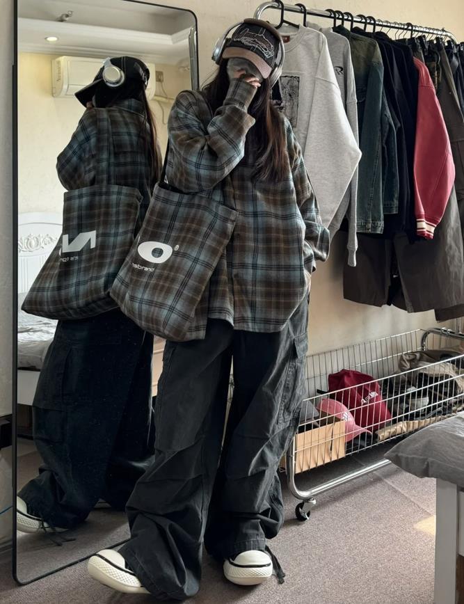 格子襯衫+白色工裝長褲+白鞋子,上繁下簡的組合,不僅顯層次,還很時髦。鬆弛感的穿搭是我最喜歡的,休閒舒適極了。