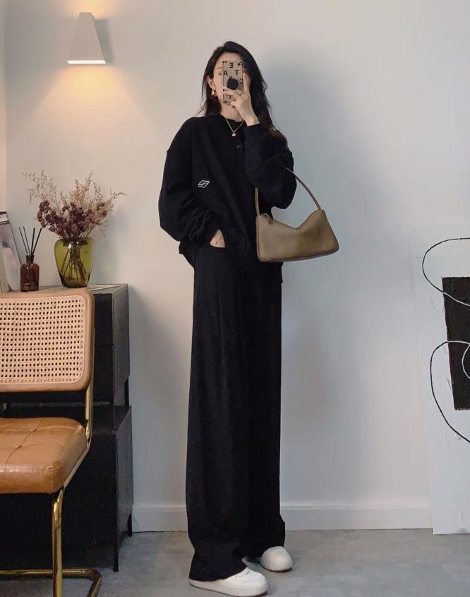 一身黑色系的搭配,看起來有些沉悶?黑色衛衣和休閒西裝褲,真的是好颯又帥氣,喜歡這種垂墜感極佳的褲子,輕鬆讓你擁有大長腿。白色運動鞋的加持,更是顯得舒適自在。