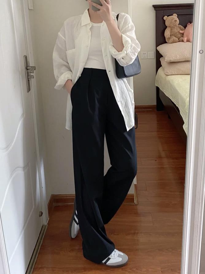 喜歡簡約風?還有慵懶風?那麼這一套就可以借鑑起來,極簡的黑白配色,有種很高級的既視感。白色棉麻襯衫和黑色休閒西裝褲,日常通勤又不失休閒舒適。