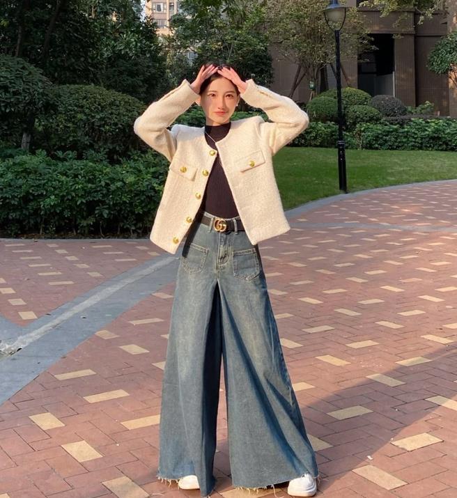 小個子也要勇敢嘗試下這種闊腿褲,大褲腳的拖地褲,真的很顯高,而且穿起來也非常舒服。一年四季都能穿,梨形身材的姐妹也可以放心衝,上衣一件短小香風外套,瞬間就優化了整個身材比例。