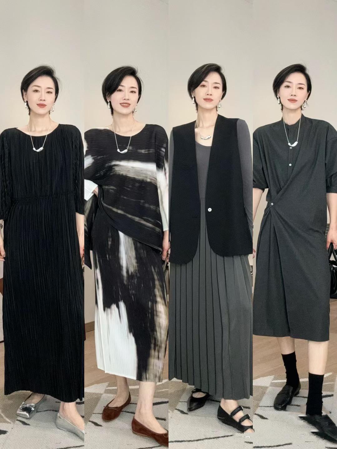 一條稍微寬鬆的連衣裙,極簡風的款式搭配了細膩的捏褶剪裁,有一種輕柔浪漫的美好。想要更端莊大氣一些,就選擇黑灰色爲底色吧,上班通勤也自帶氣場。