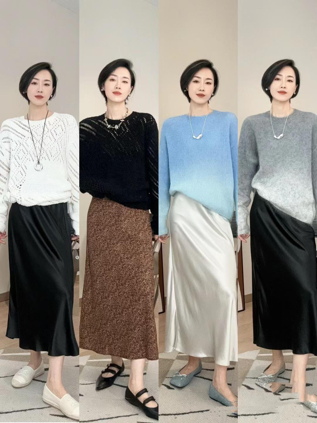 稍微寬鬆的針織衫,自然還是與高腰的A字形半身裙更加匹配。尤其是緞面材質或者醋酸材質的A字形半身裙,穿起來更加舒適貴氣,同時掩蓋腰胯粗壯格外的顯瘦。