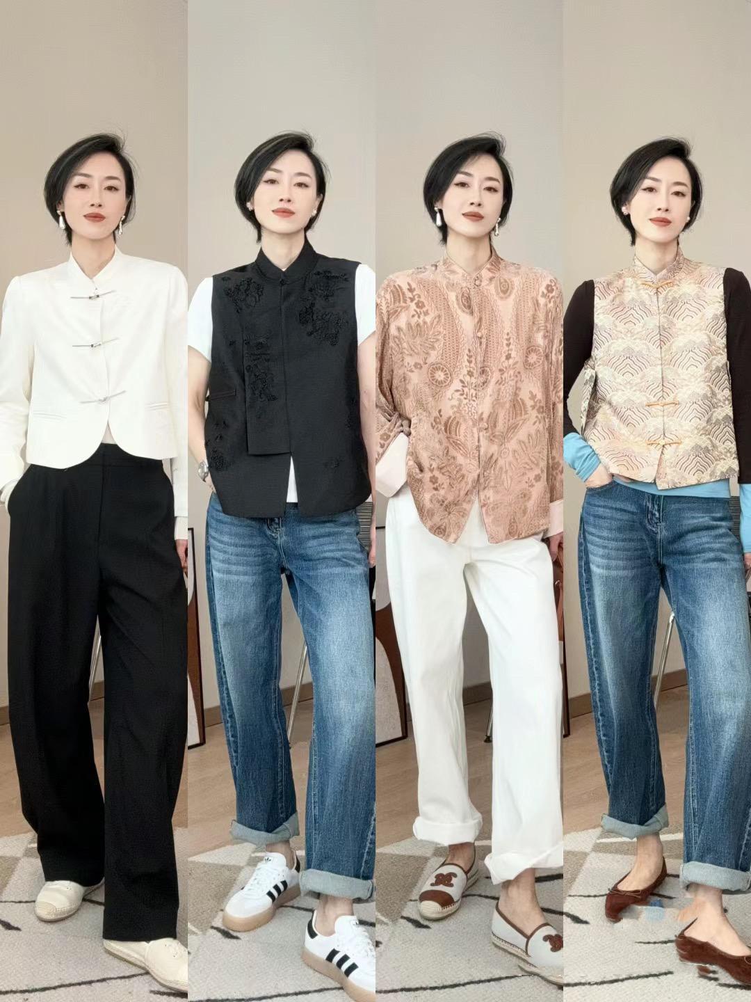 不管是酸款的新中式外套,還是新中式馬甲,在這個春天都可以信手拈來、給我們更舒適的自由。搭配高腰的直筒牛仔褲、或者闊腿褲,都更加舒適體面一些。