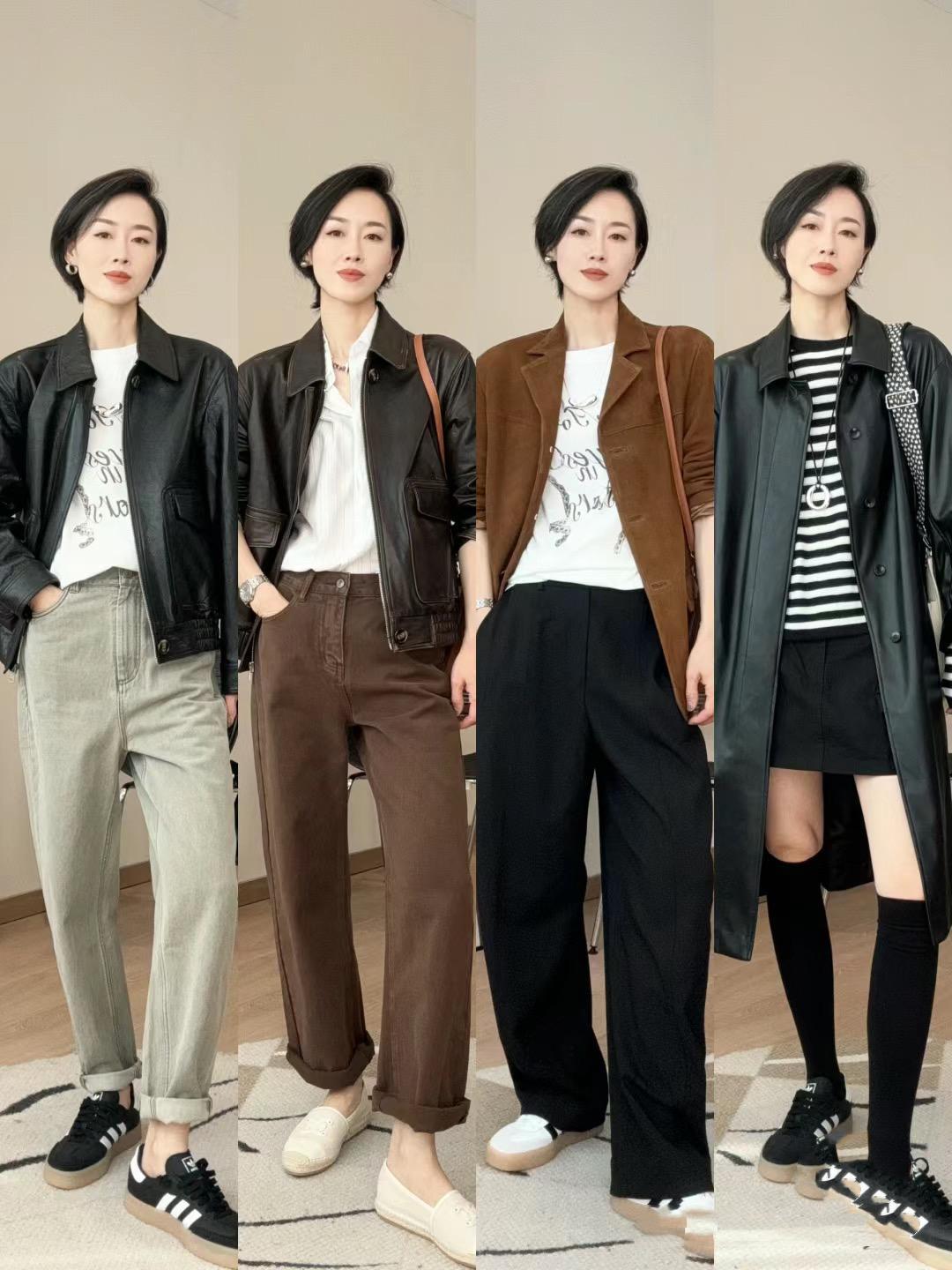 40+女性,不止於溫柔甜美,更可以帥酷瀟灑。穿一件利落的皮衣夾克,既可以擋住春天肆虐的風,又可以表現出女性的剛毅有力。