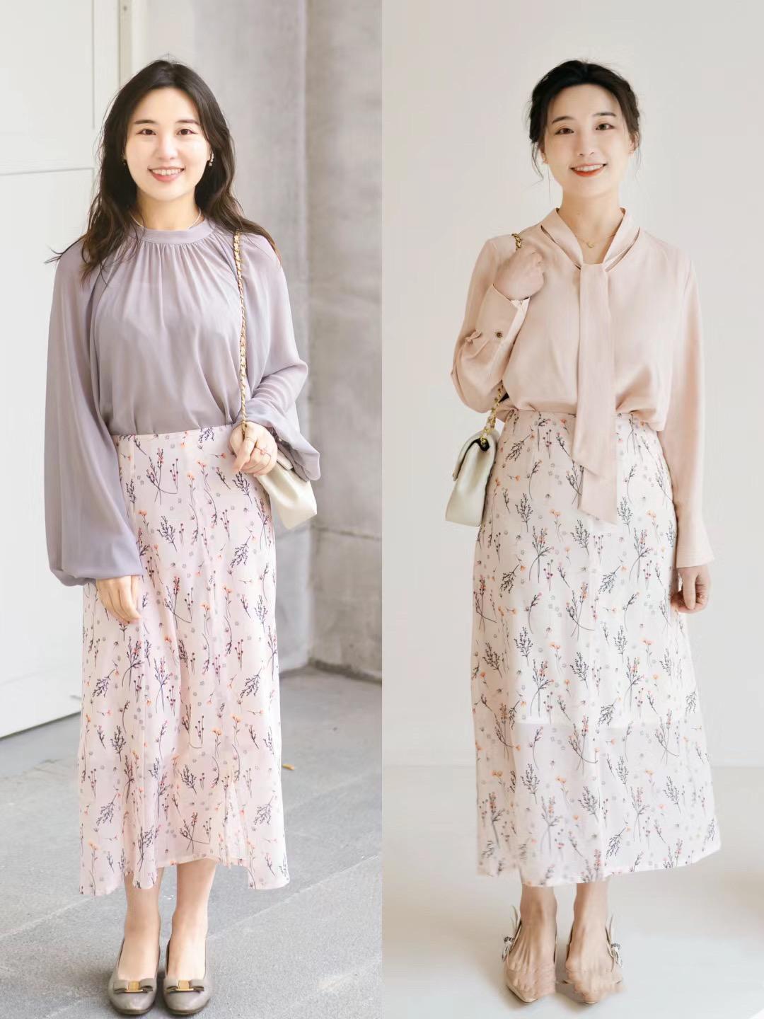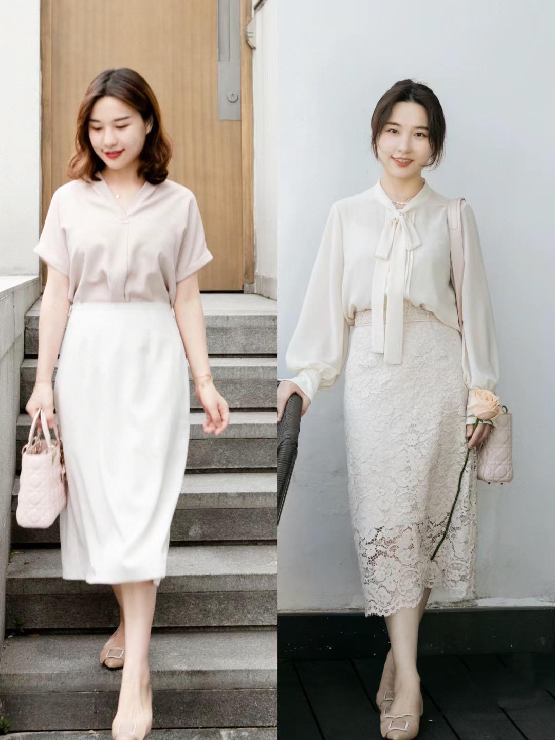 過膝裙儘量配高腰的款式,腰臀部收緊的剪裁。搭配同色系的上衣可以表現出腰臀部的線條感。比如飄帶襯衫+蕾絲半身裙,同色系的組合就溫婉洋氣,飄帶襯衫的組合、可通勤可休閒。