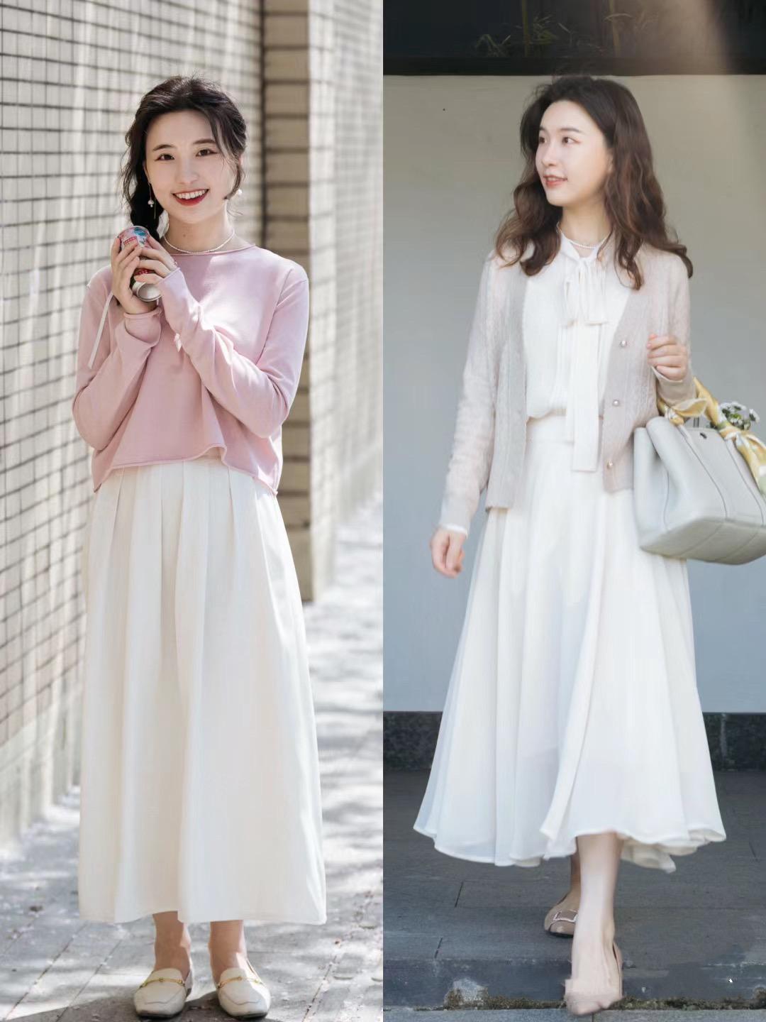比如A字形的過膝裙,高腰的款式、波浪的裙襬,給人一種溫婉大氣的美。白色系的過膝裙,非常符合春季氛圍,腰粗、胯寬的女性也可以穿着。