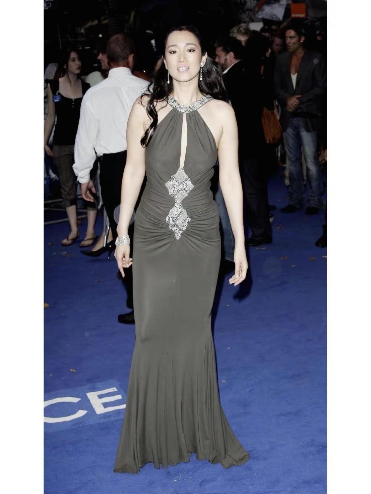 鞏俐這條灰色系掛脖裙的設計,還是非常個性的。掛脖的設計,必然會露出雙肩的線條。這對大多數女性來講,都不是那麼友好。