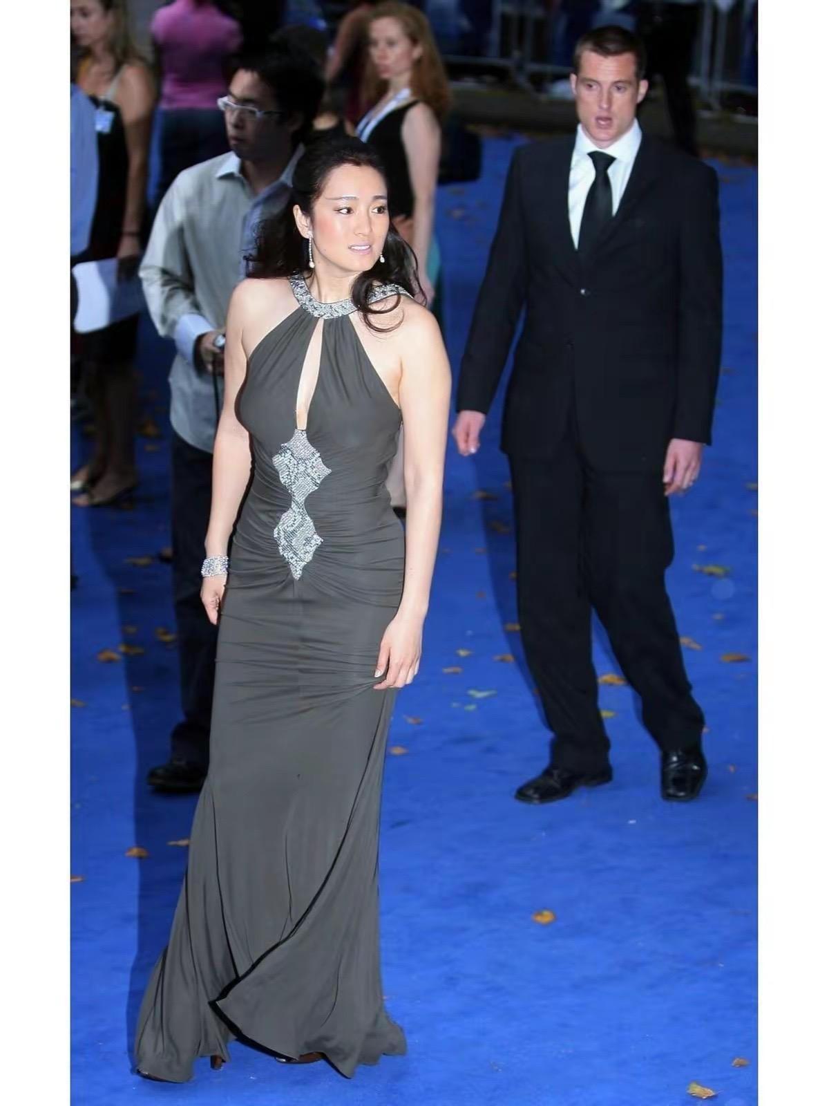 鞏俐穿一條灰色系的掛脖裙,修身的剪裁累着有一點壯碩的體型。雖然她的身體曲線不是那麼完美,但全身沒有贅肉的體型、也是很耐看。