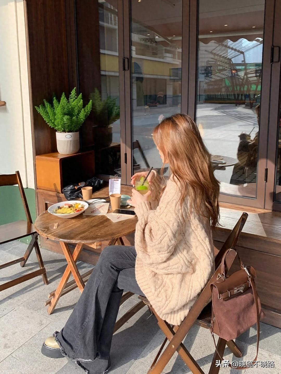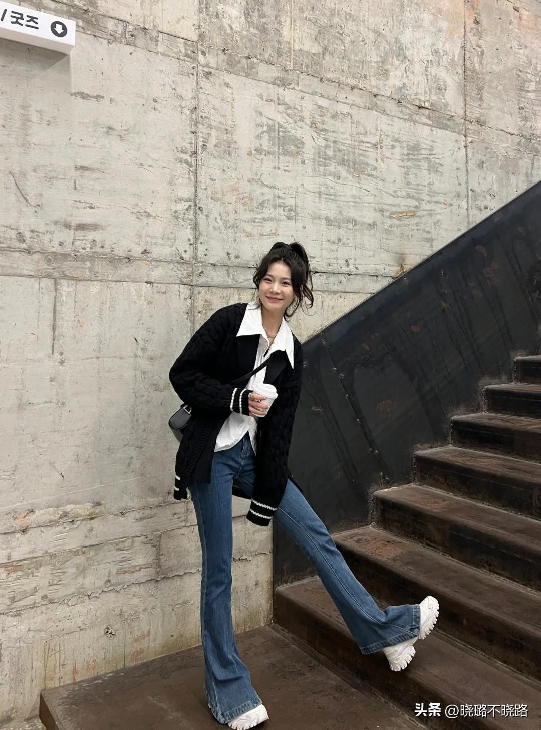 搭配舉例:針織開衫+翻領內搭+牛仔“馬蹄褲”