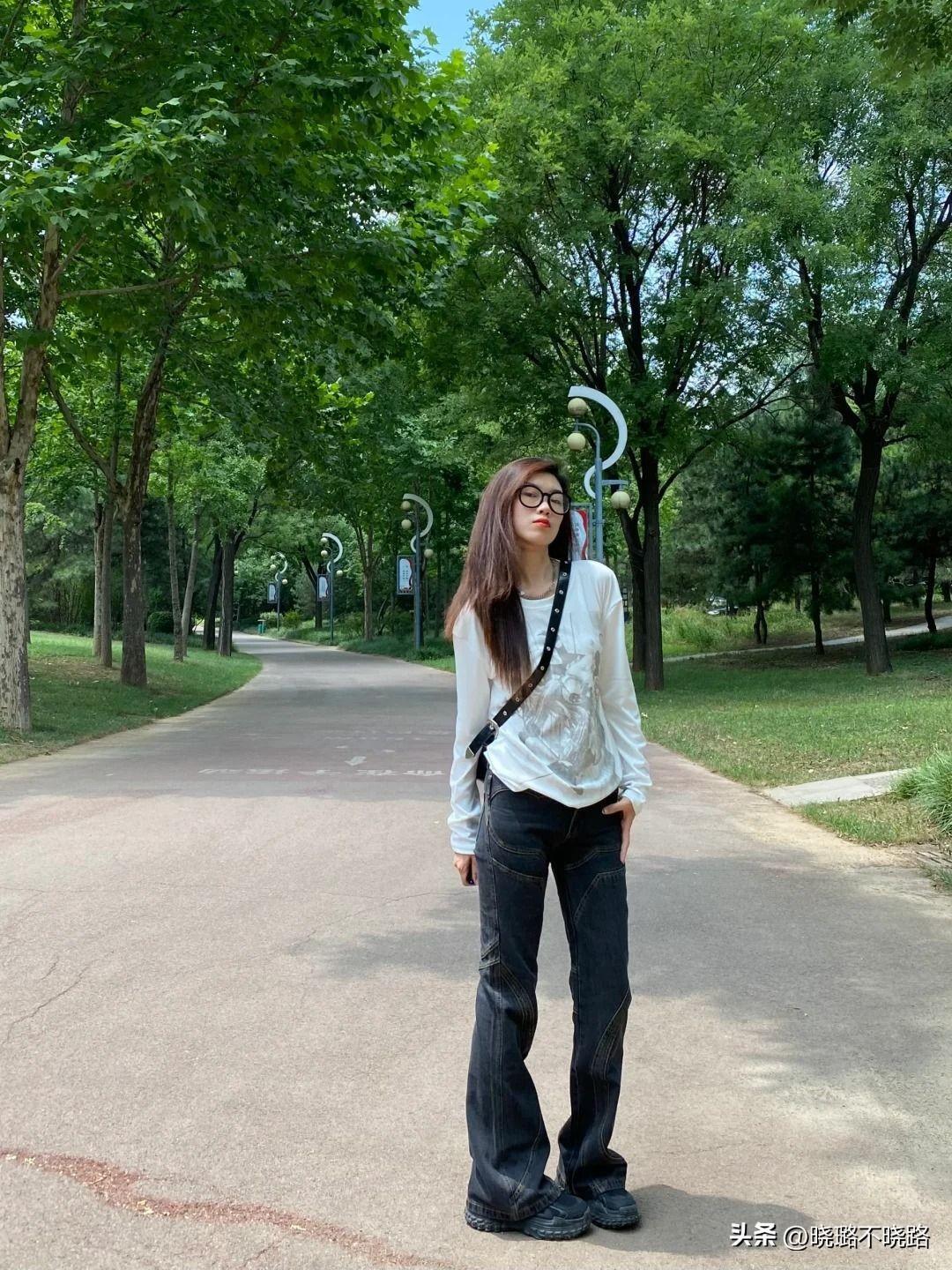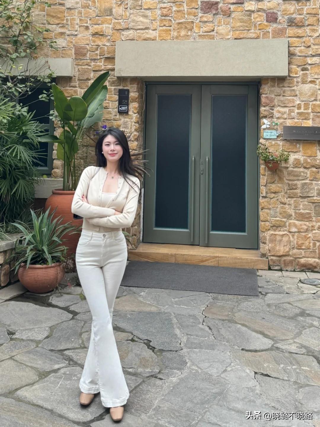 如果本身贅肉比較少,可以利用“馬蹄褲”搭配一些修身的上衣,利用淺淺結合的當時,把上下之間的過渡變得更加自然。同時這樣的組合方式瞧着並不會在橫向上產生太多的膨脹問題,從視覺的角度看來反而是縱向以及整體凹凸感會更加強烈一些。