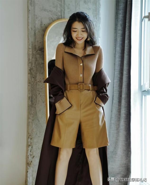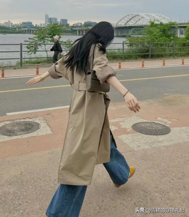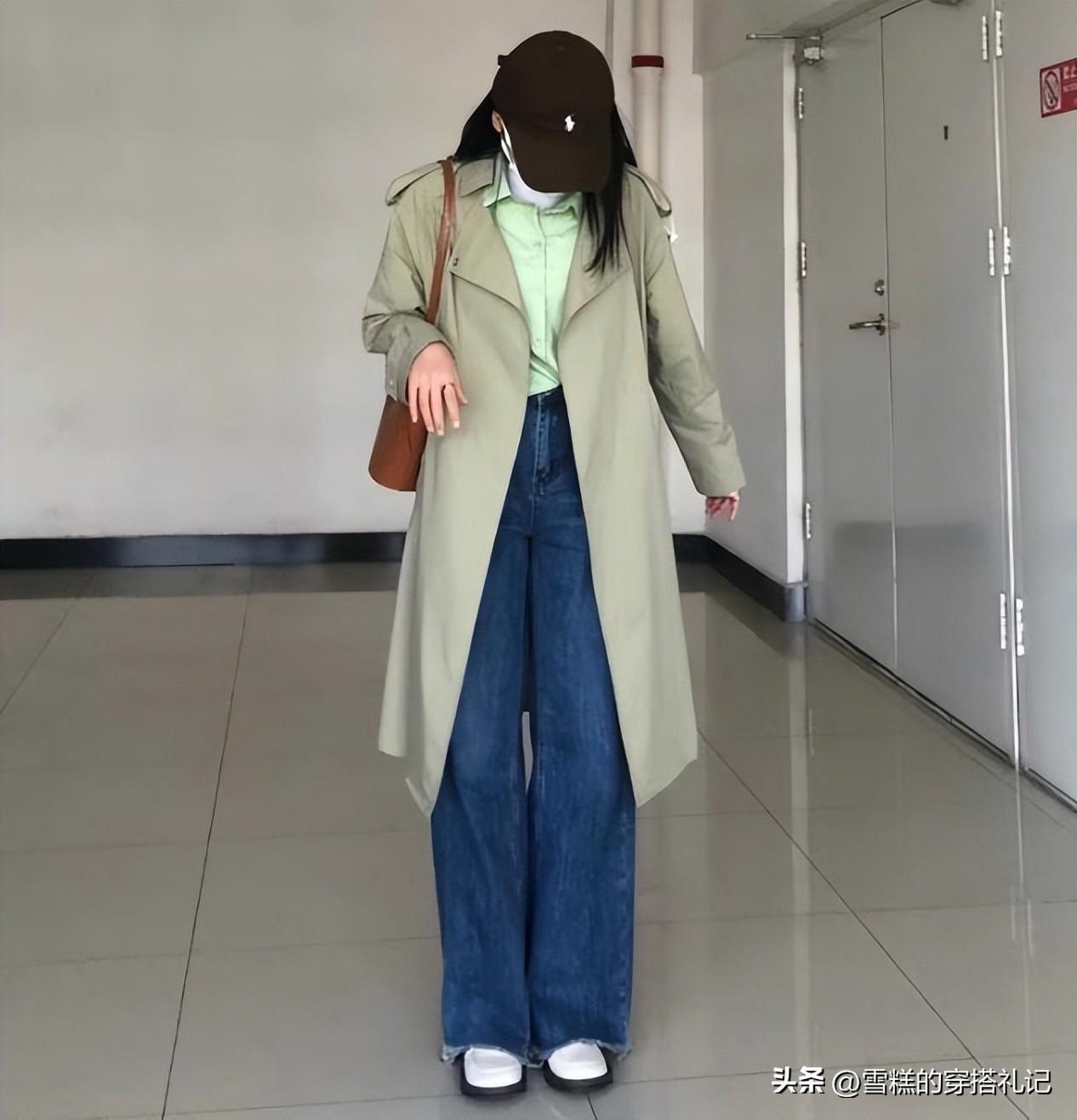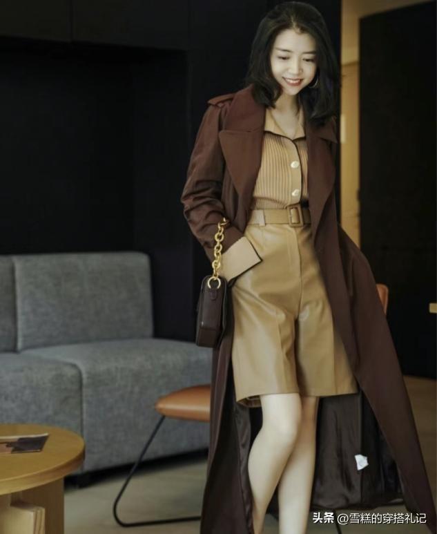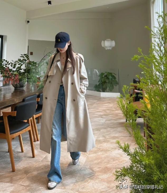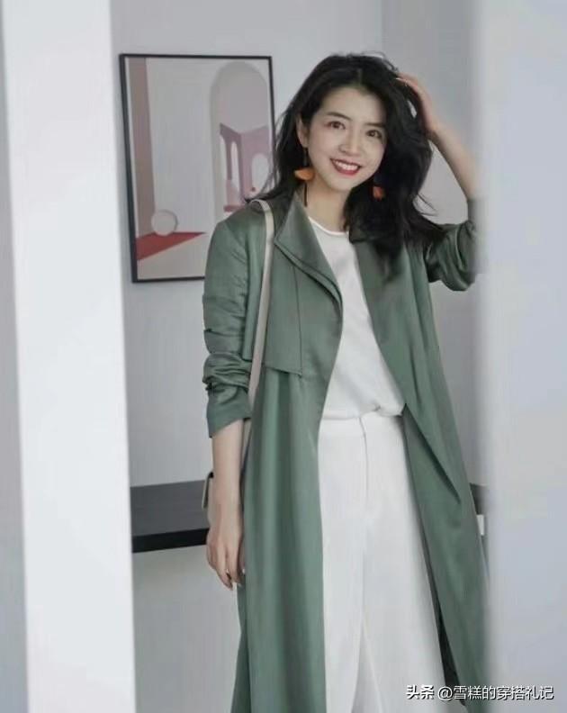 另外一種就是看裙裝或者褲子的顏色,利用牛仔藍色或者黑色來弱化線條膨脹感,那麼,內襯的款式就比風衣的顏色更深,由此凸顯出外套的色彩,展示出氣質顯白顯嫩的效果。