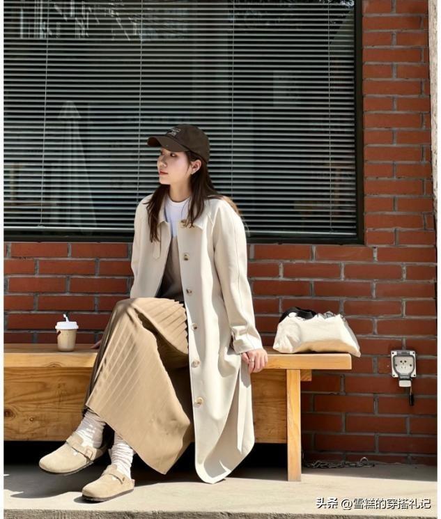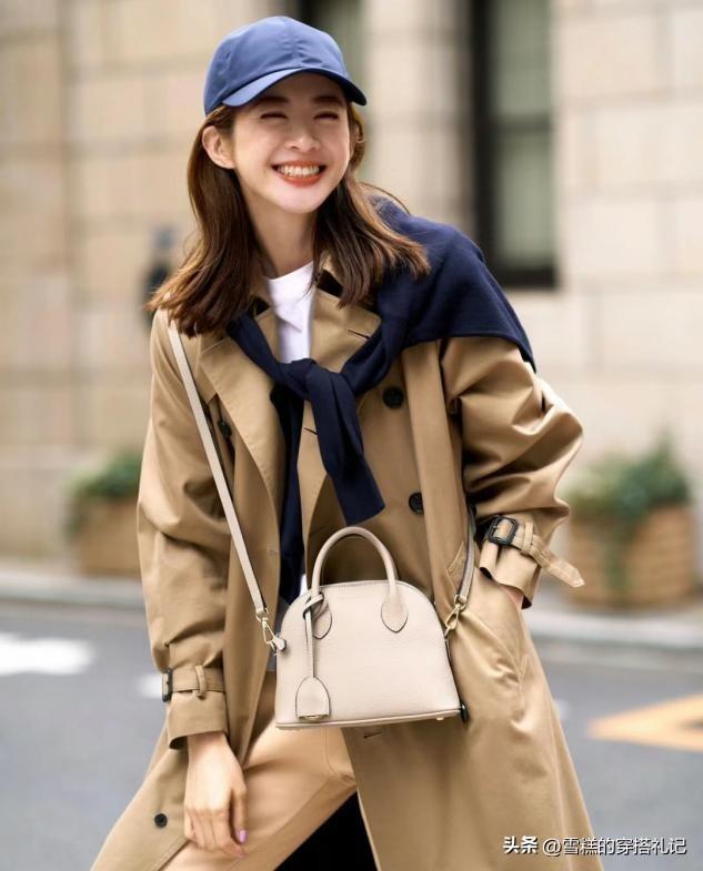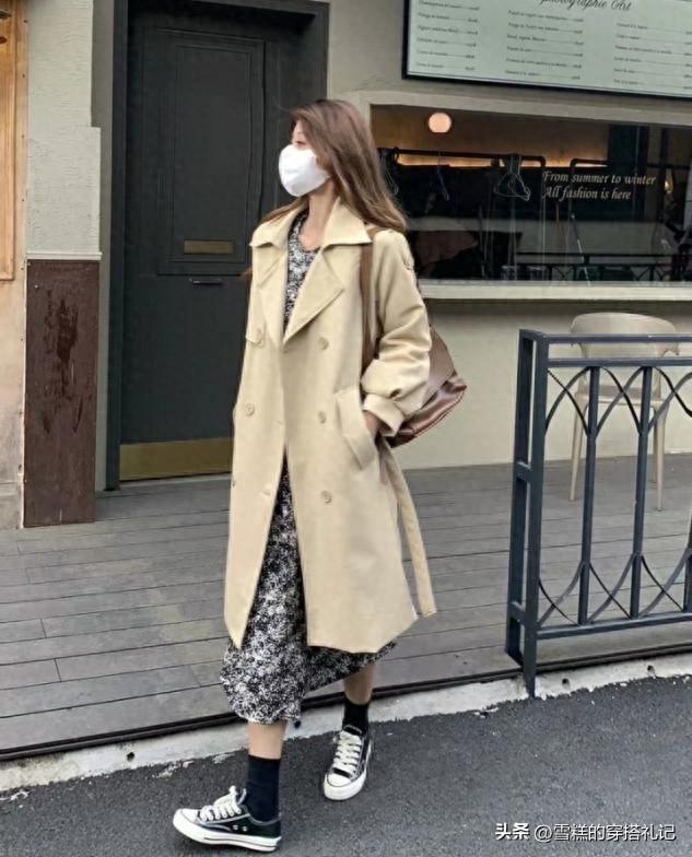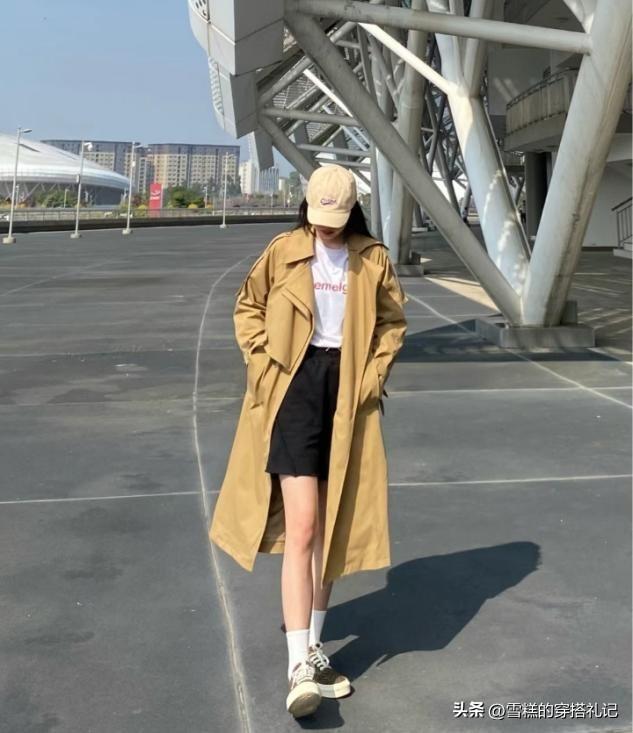風衣的色彩決定了第一眼的視覺亮度,卡其色風衣是最常見的,這種中性偏淺的色彩,搭配白色的內襯裙裝,整體的配色溫和而又大氣,彰顯年輕感的優勢無與倫比。