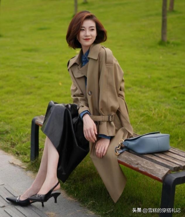 長款風衣的設計,與高跟鞋是一種線條的融合,拉長線條比例的效果,腳踝一定要適當的露出佔比,彰顯出雙腿線條的精緻和利落感,雙腿的部分就用裸色的絲襪或者是打底褲來做好保暖,裙子的長度過膝,但是露腳踝,上了年紀也可以穿的很輕盈。