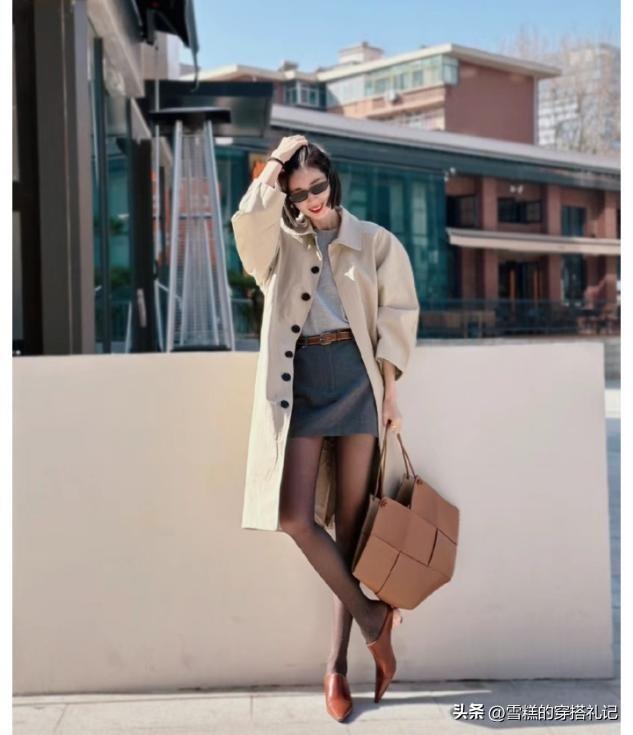 一件長款的風衣搭配短裙,可以按照圖中的造型照搬搭配,黑絲的運用,增加嫵媚的女人氣質,穿高跟鞋就優化了腿長比例,用一條短裙搭配長款風衣,長短線條展示出恰好的層次感,誰能不愛呢?
