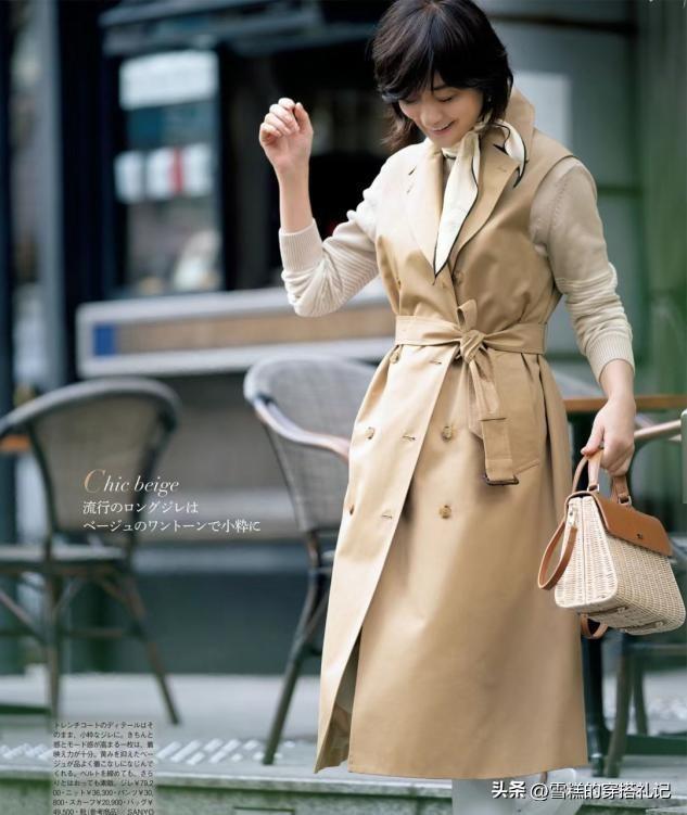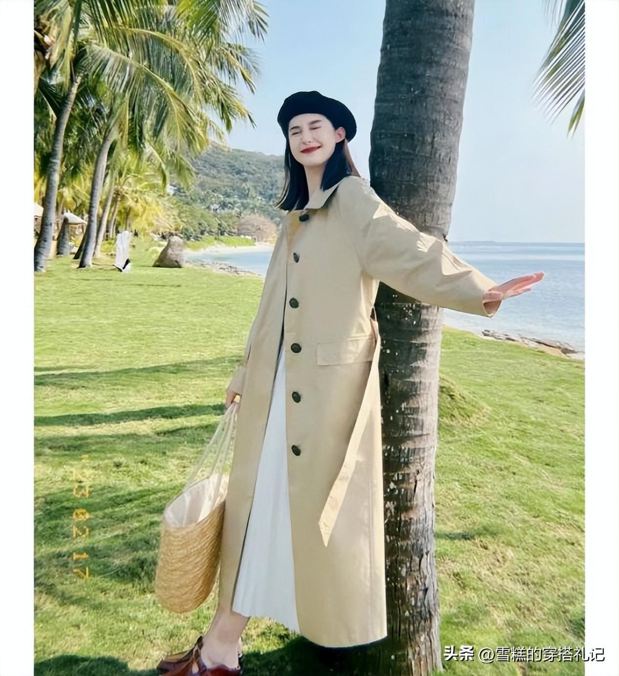 ①卡其色風衣最常見,配白色裙裝是萬能組合