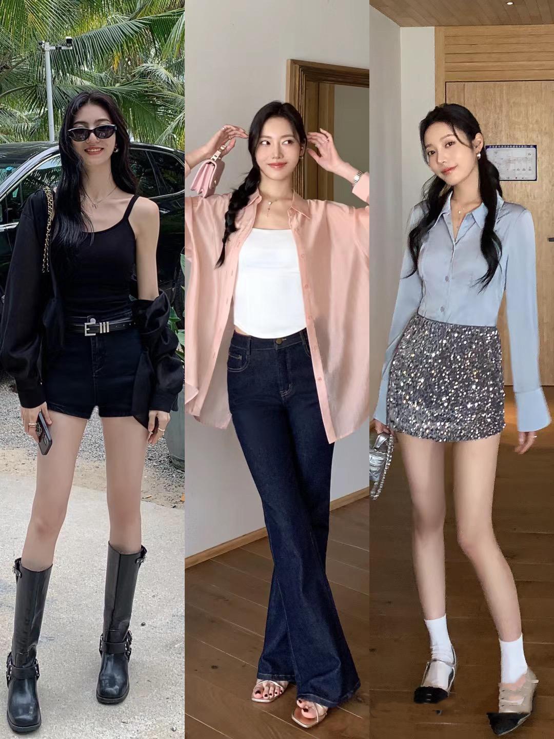 用黑色襯衫疊搭修身的黑色吊帶,露出肩部和手臂線條、更多了幾分熱辣與骨感。寬鬆的香檳色襯衫,直接搭配修身的白色吊帶,隨性慵懶。淺藍色襯衫搭配不靈不靈的半身裙,精緻又閃耀。