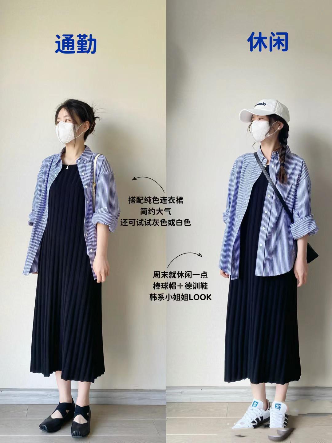 不管是日常休閒風、還是上班通勤風,都可以選擇用襯衫+黑色連衣裙來凹造型,如果想要風格偏向休閒一點,可以搭配鴨舌帽、德訓鞋,有一種韓系小姐姐的時尚範。