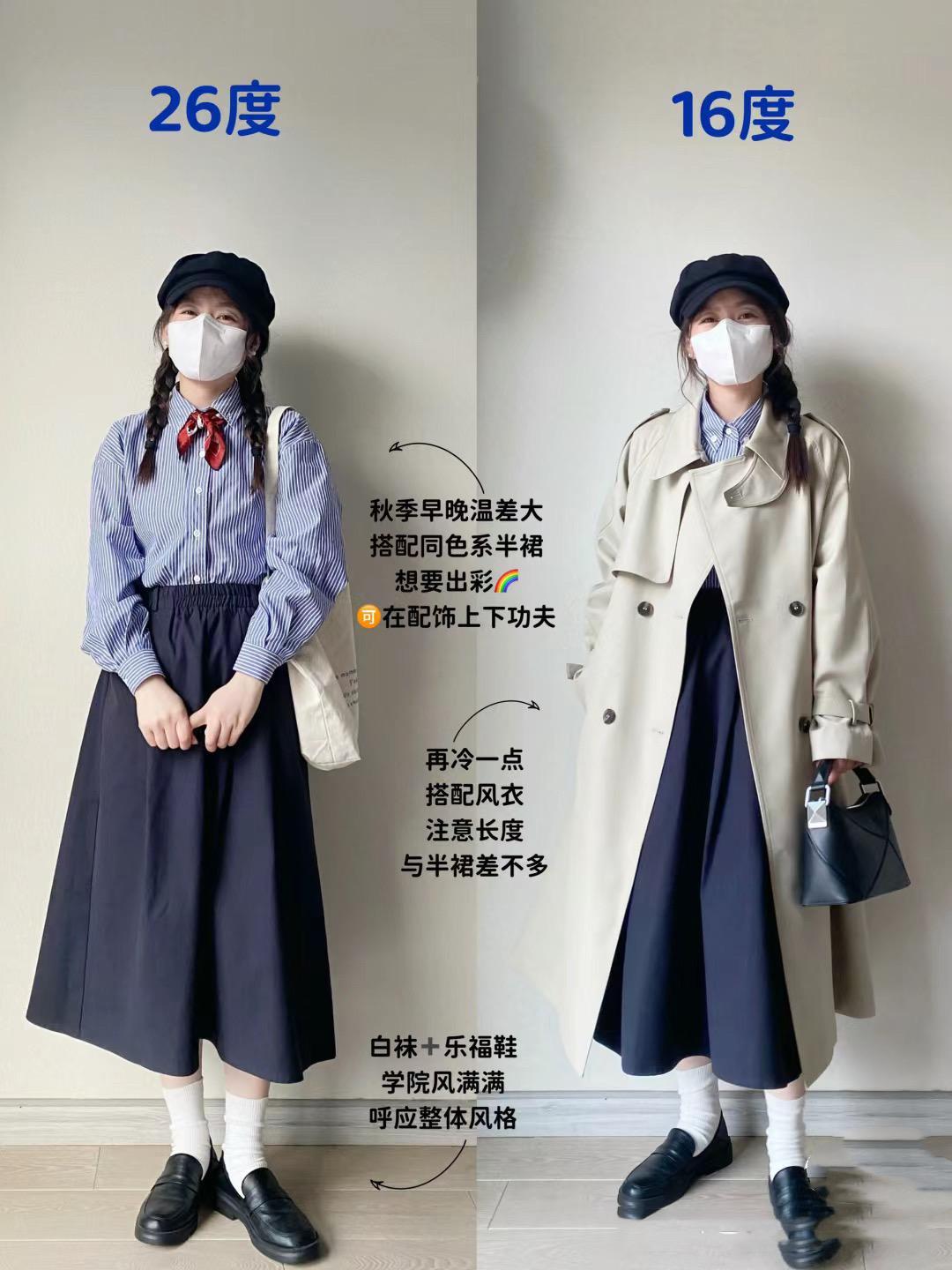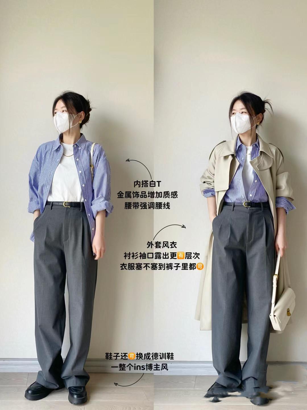 如果是在溫度稍高的晴天,我們可以用條紋襯衫來搭配百褶連衣裙,溫柔中多了幾分英氣,通勤上班也不會遜色。溫度低一點的時候,還可以疊搭風衣外套,就足夠保暖了。