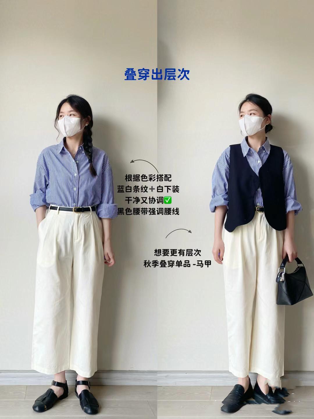 如果想要更豐富的層次感,我們在穿着條紋襯衫+白色直筒褲的時候,可以疊搭一件黑色馬甲。黑色馬甲與黑色手拿包、黑色樂福鞋實現了視覺上的呼應,整體風格更高級端莊。