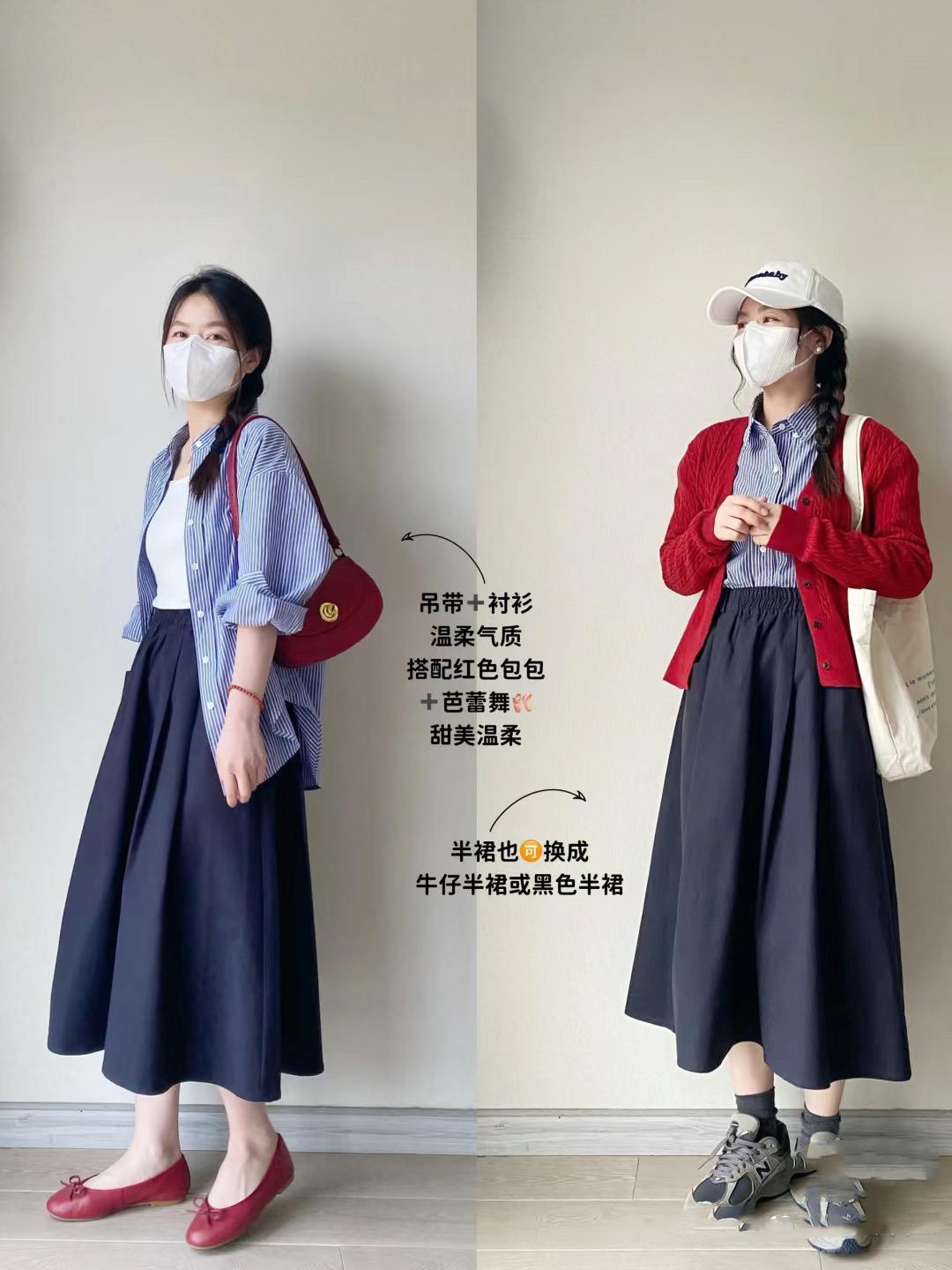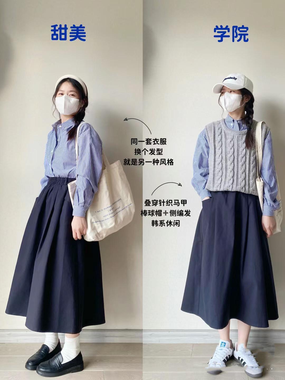 到了中午,可以直接穿着條紋襯衫來搭配深藍色半身裙,色彩屬性上的相同給人一種高級美。我們需要注意半身裙儘量配挺闊的面料,不會顯得邋遢臃腫。