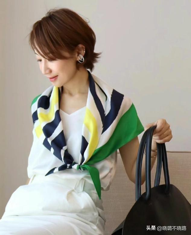 私下比較隨性的穿搭選擇,那麼我們更適合有花色點綴的絲巾,比如說色塊的相互拼接款式,可以讓你純色系的服裝增加出一色亮眼的效果,匹配上純色的包包和鞋子,主打的是一種分寸有度的選擇。