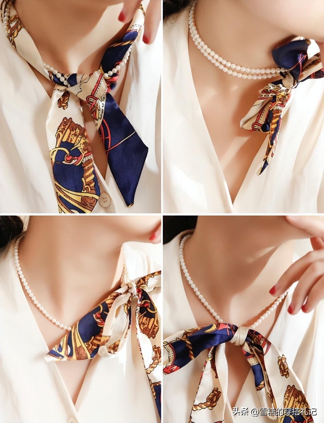 ✔珍珠首飾新時髦:珍珠項鍊+絲巾疊戴
